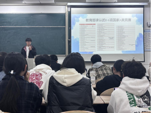 科协主席李思源为新生带来了一场精彩的"科协第一课"。他系统介绍了13个A级赛事,帮助新同学深入了解与专业相关的竞赛平台。期盼通过比赛认识更多优秀的同学,锻炼团队协作能力,积累竞赛经验,充实大学生活。